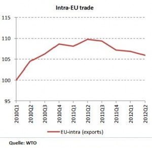 Die Importnachfrage in der EU hat sich dramatisch abgeschwächt, was nach Ansicht der WTO zu weniger Intra-EU-Handel führe (“However, import demand in the European Union has weakened significantly, resulting in less trade between EU countries intra-trade”). Deutlicher wäre es wohl zu attestieren: Die Rezession in der EU bzw. Eurozone hat auch zu einer kräftigen Abschwächung der Importnachfrage der EU gegenüber Drittländern außerhalb der EU geführt und belastet daher inzwischen den Welthandel insgesamt.