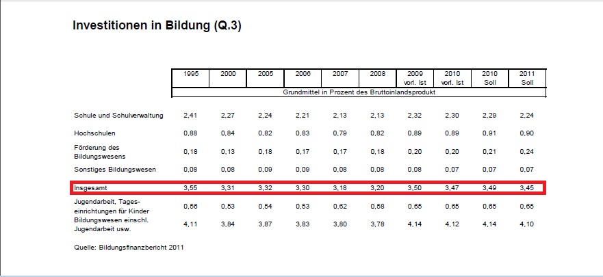 Investitionen in Bildung sinken (Zur Vergrößerung auf Tabelle klicken.) Quelle: Lebenslagen in Deutschland – Entwurf des 4. Armuts- und Reichtumsberichts der Bundesregierung