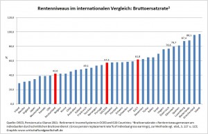 Es sticht heraus, dass Nachbarländer wie Österreich, Dänemark, Luxemburg und die Niederlande mit einer Nettoersatzrate von zum Teil weit über 90 Prozent, deutlich über dem deutschen Nettorentenniveau (56 Prozent) liegen. Das gleiche gilt im Falle Österreichs, Dänemarks, Luxemburgs und der Niederlande auch für die Bruttoersatzrate. Auch in Frankreich liegen das Brutto- wie das Nettorentenniveau höher als in Deutschland, wenn auch niedriger als der OECD-Durchschnitt und als der EU-27-Durchschnitt.
