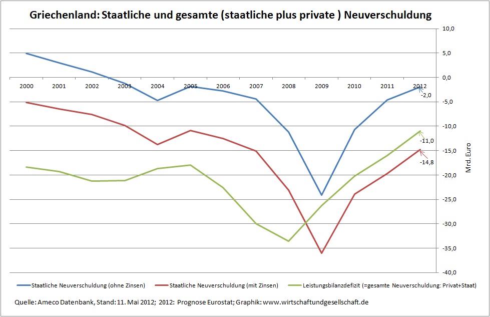 Griechenland: Staatliche und gesamte Neuverschuldung 2000 bis 2012 (Zur Vergrößerung auf Graphik klicken.)