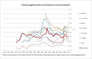 “In der Debatte über den Etat für 2013 sagte der Haushaltsexperte der Partei, Schneider, angesichts boomender Steuereinnahmen, Entlastungen bei Zinsen sowie geringeren Sozialausgaben hätte die Neuverschuldung längst auf null gedrückt werden müssen. Hier habe Finanzminister Schäuble versagt. Schäuble verteidigte den Entwurf der Regierung. Die Finanzpolitik von Union und FDP ziele darauf ab, bei steigenden Steuereinnahmen die Ausgaben konstant zu halten, sagte der CDU-Politiker. Dadurch erreiche man die Ziele der Schuldenbremse des Grundgesetzes drei Jahre früher als vorgeschrieben”, so der Deutschlandfunk weiter.