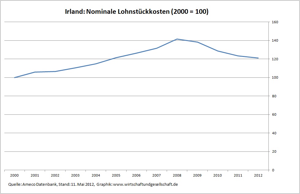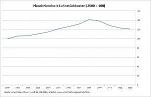Entwicklung der nominalen Lohnstückkosten in Irland, 2000 bis 2012 (Zur Vergrößerung auf Graphik klicken.)