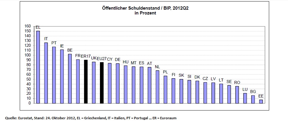 “Die höchsten Verschuldungsquoten (öffentlicher Schuldenstand im Verhältnis zum BIP) verzeichneten am Ende des zweiten Quartals 2012 Griechenland (150,3%), Italien (126,1%), Portugal (117,5%) und Irland (111,5%)…” Und: “Die höchsten Anstiege verzeichneten Griechenland (+13,4 Prozentpunkte, Pp.), Zypern (+8,3 Pp.) und Portugal (+5,6 Pp.)…”