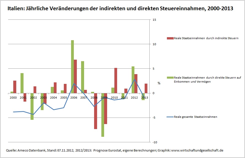 Italien: Entwicklung der direkten und indirekten Steuereinnahmen, 2000 bis 2013 (Zur Vergrößerung auf Graphik klicken.)