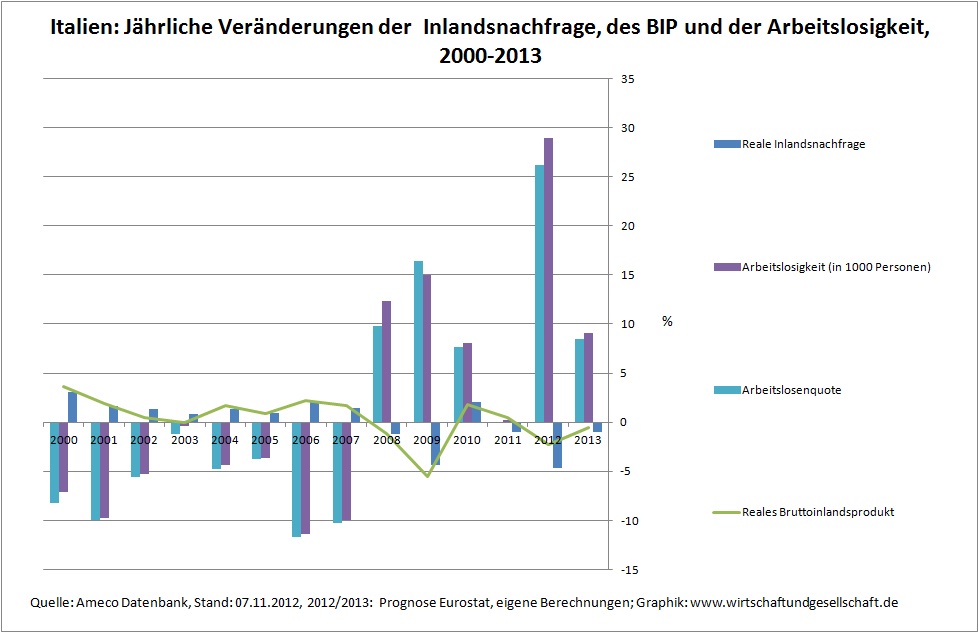 Die Inlandsnachfrage ist in Folge der Finanzkrise 2007/2008 eingebrochen. Sie konnte sich 2010 zwar erholen, ist aufgrund der Kürzungsorgie seitdem aber erneut rückläufig. Die inländische Nachfrage ist der zentrale Einflussfaktor für das Wirtschaftswachstum und damit für die Beschäftigung. Angemessenes Wirtschaftswachstum, das zum Abbau der Arbeitslosigkeit beiträgt, hatte Italien zuletzt 2007, vor Ausbruch der Finanzkrise – und zwar durchgehend seit 1999/2000.