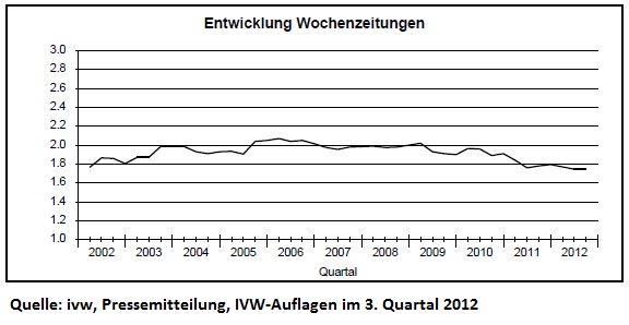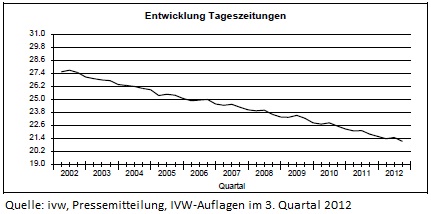 Die ivw meldet in ihrem letzten Quartalsbericht jedoch auch, dass “die Mehrzahl der Pressegattungen” für das 3. Quartal 2012 im direkten Vergleich mit dem Vorjahr wieder rückläufige Auflagen verzeichnete.