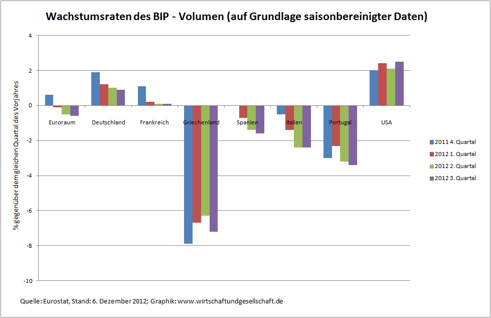 Wachstumsraten des Bruttoinlandsprodukts 4. Quartal 2011 bis 3. Quartal 2012 in der Eurozone und den USA (Zur Vergrößerung auf Graphik klicken.)