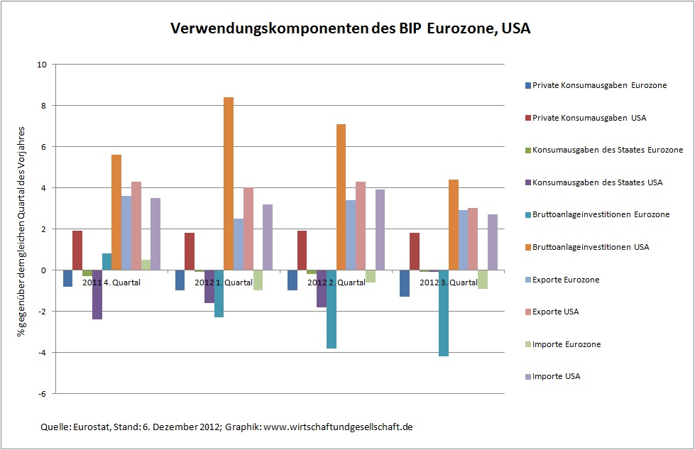 Verwendungskomponenten des Bruttoinlandsprodukts 4. Quartal 2011 bis 3. Quartal 2012 in der Eurozone und den USA (Zur Vergrößerung auf Graphik klicken.)