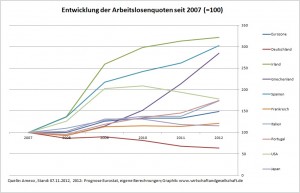 Immerhin streift Steinbrück diese entscheidende ökonomische Ursache für die Eurokrise – und immerhin begreift er diese auch endlich als “Krise des Euro”, auch das ein Fortschritt; handelte es sich für Steinbrück bei der Eurokrise doch bis zuletzt explizit “nicht um eine Eurokrise, sondern um eine Refinanzierungskrise einzelner Staaten“! Steinbrück benennt tatsächlich “das Auseinanderdriften der Wettbewerbsfähigkeit in Europa” als zentrales Problem. Und er schreibt von einer “Behebung” dieser Ursache, die “auf der Agenda 2013″ stehen müsse. Wie er allerdings auf dieses Problem eingeht, zeigt, dass er immer noch nicht verstanden hat oder nicht verstehen will:
