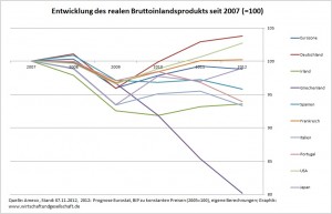 Entwicklung des Bruttoinlandsprodukts in der Eurozone, den USA und Japan seit 2007 (=100) (Zur Vergrößerung auf Graphik klicken.)