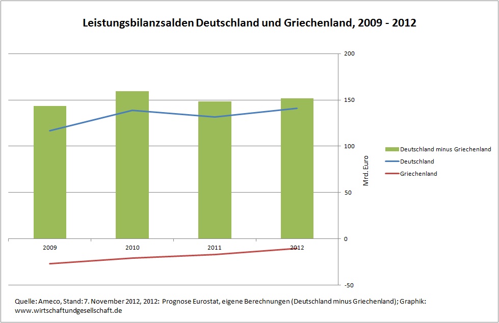 Leistungsbilanzsalden Deutschland, Griechenland, 2009 bis 2012 (Zur Vergrößerung auf Graphik klicken.)