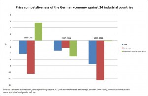 But if you look into the recent January Monthly Report 2013 of the Bundesbank you realize again who is the culprit. On the basis of statistics from the German central bank based on total sales deflators (1. quarter 1999 =100) Germany´s price competitiveness against 24 industrial countries inside and ouside the Euro area has improved during the period 1999 to 2011. Data for 2012 is not yet available. The negative bars in the diagram signal a real devaluation of Germany against the 24 industrial trading partners. And it is interesting to see, that devaluation against countries outside the Euro area has taken off in the period after the outbreak of the financial and Euro crises. Honi soit qui mal y pense.