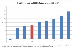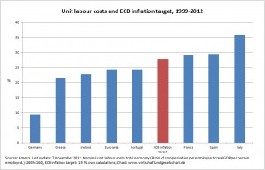 “A 23 % increase in unit labour costs relative to the rest of the euro area would be needed in Germany to restore 1998 relative competitiveness levels, for instance. If rebalancing takes place only in the countries under financial market stress, the costs would be very high as downward adjustments to relative wages and prices in these countries are currently occurring through economic weakness and high unemployment.”