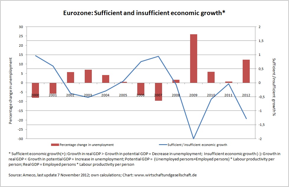 Since 2009 real growth in gross domestic product (GDP) is below growth in potential GDP. Under these circumstances unemployment has to rise (explanatory remark see * in the chart).
