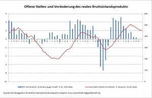 Offene Stellen und Veränderung des realen Bruttoinlandsprodukts, Januar 2000 bis Februar 2013 (Zur Vergrößerung auf Graphik klicken.)