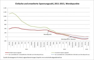 Darüber hinaus verläuft die Spannungszahl weiterhin unterhalb der Kurve der an den beiden Wendepunkten im Januar 2012 und im August 2012 festgelegten unveränderten wirtschaftlichen Aktivität. Auch gegenüber den eingetragenen Wendepunkten hat sich also die wirtschaftliche Lage weiter verschlechtert.