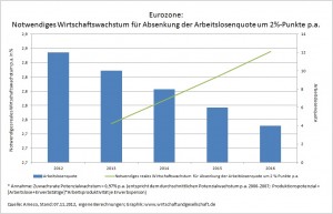 Unter Zugrundelegung der im Zeitraum zwischen 2000 bis 2007 erzielten durchschnittlichen jährlichen Zuwachsrate des Produktionspotenzials (Arbeitslose+Erwerbstätige*Arbeitsproduktivität je Erwerbsperson) müsste das reale Wirtschaftswachstum in der Eurozone um jährlich rund drei Prozent zunehmen, um die Arbeitslosenquote von zwölf Prozent um jährlich zwei Prozentpunkte zu senken und so 2016 eine Arbeitslosenquote von vier Prozent zu erreichen. Eine Arbeitslosenquote von drei Prozent gilt allgemein als Vollbeschäftigung.