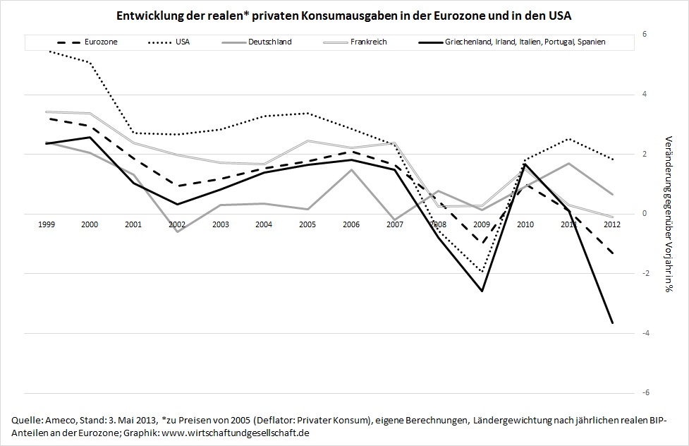 Das Ergebnis lautet leider: Keine “Konsumfreude” weit und breit. Am ehesten könnten diese noch die USA für sich beanspruchen. Zwar schwächte sich der Zuwachs des privaten Konsums im vergangenen Jahr auch dort ab; er legte aber immer noch deutlich stärker zu als in Deutschland. Katastrophal ist die Entwicklung in Griechenland, Irland, Italien, Portugal und Spanien. Die Entwicklung dort zeigt, welche Opfer die verordneten staatlichen Ausgabenkürzungen, Massenentlassungen und Lohnkürzungen den Menschen dort abverlangen.