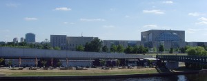 Ich schaue hinüber zum anderen Ufer der Spree und muss kurz an die DDR-Flüchtlinge denken, die hier vielleicht verzweifelt und tollkühn versucht hatten durch die Spree schwimmend in den Westen zu flüchten. Was die wohl heute denken, beginne ich zu sinnieren, so sie denn das andere irre Regime lebend hinter sich gelassen haben. Toter als das Ufer jetzt dort drüben da liegt, wird es zu DDR Zeiten hier auch nicht ausgesehen haben. Die Proll-Bar “Capital Beach” - ich hätte sie wenigstens Capital Bitch genannt, wenn schon denn schon - döst einsam und verlassen in der Sonne; alle Sonnenstühle, die sonst aufgestellt und mit Leben gefüllt das Ufer bevölkern, liegen aufgestapelt, tot, Leichen gleich; dabei hätte man sie heute so gut gebrauchen können – die Sonnenstühle; nichts bewegt sich dort driben. Kein Wunder wenn man auch nicht rüber machen kann. Tot wie ein gefallener Soldat in Afghanistan. Tot wie durch den Einsatzbefehl eines deutschen Oberst in Afghanistan in die Luft gesprengte Kinder und Zivilisten liegt alles da. Ist glaube ich mittlerweile zum General aufgestiegen dieser Oberst. Na ja, noch geht Deutschland ja auch nicht ganz unter. Kein Grund also Widerstand zu leisten. Nicht für einen General oder Oberst jedenfalls. Und deutsche Soldaten müssen im Ausland ja wirklich ganze Arbeit geleistet haben, denke ich, wenn sie das hier alles zu ihrem Schutz brauchen. Dabei sollten sie doch uns am Hindukusch verteidigen, so der frühere Verteidungsminister Peter Struck (SPD) damals. Gott hab´ ihn und die vielen getöteten afghanischen Zivilisten und deutschen Soldaten selig. Jetzt müssen sie verteidigt werden, im eigenen Land. Eindrucksvoller kann man das Scheitern in Afghanistan und das Scheitern, politische Ziele mit militärischen Mitteln durchsetzen zu wollen, doch gar nicht veranschaulichen.
