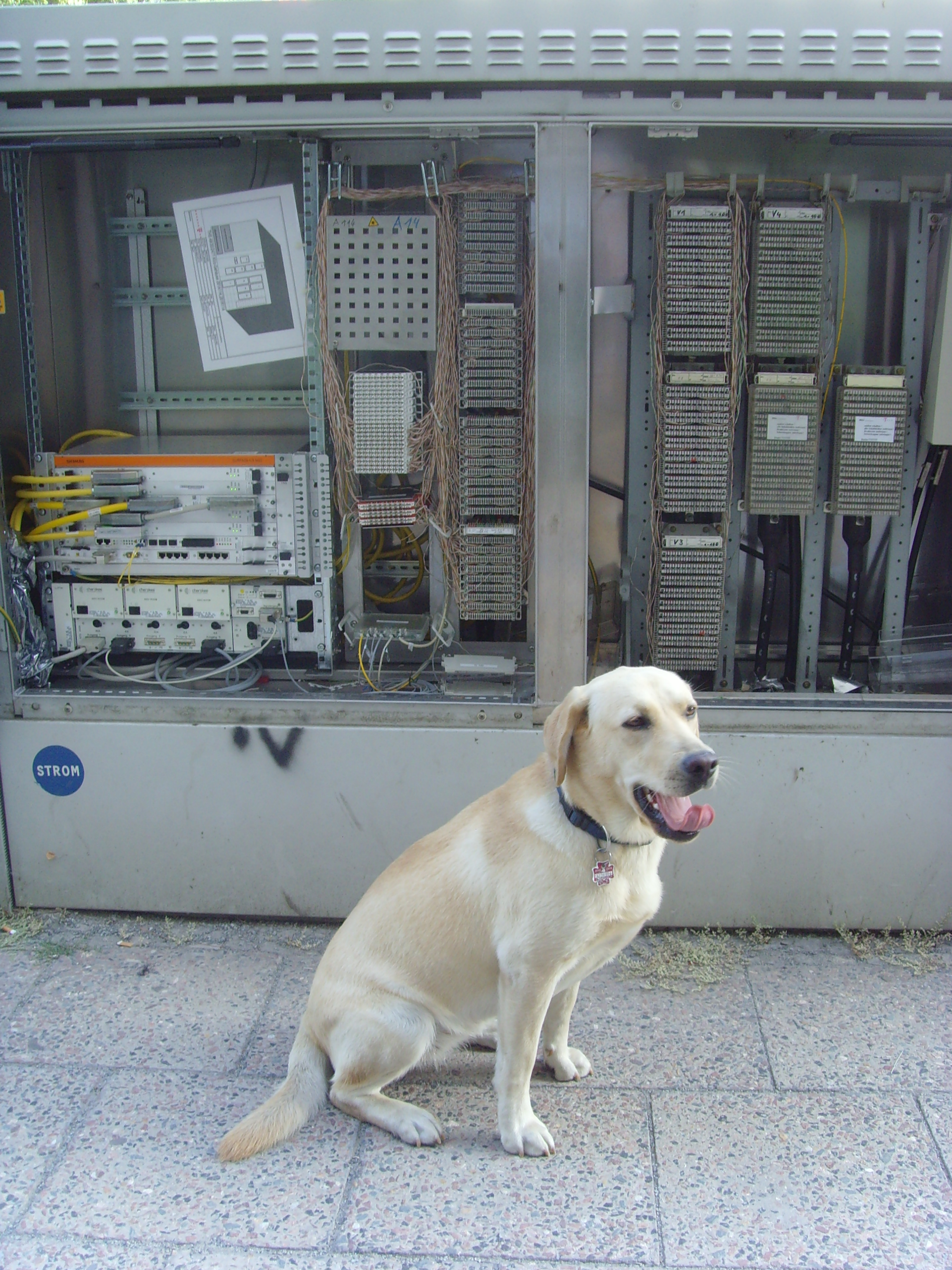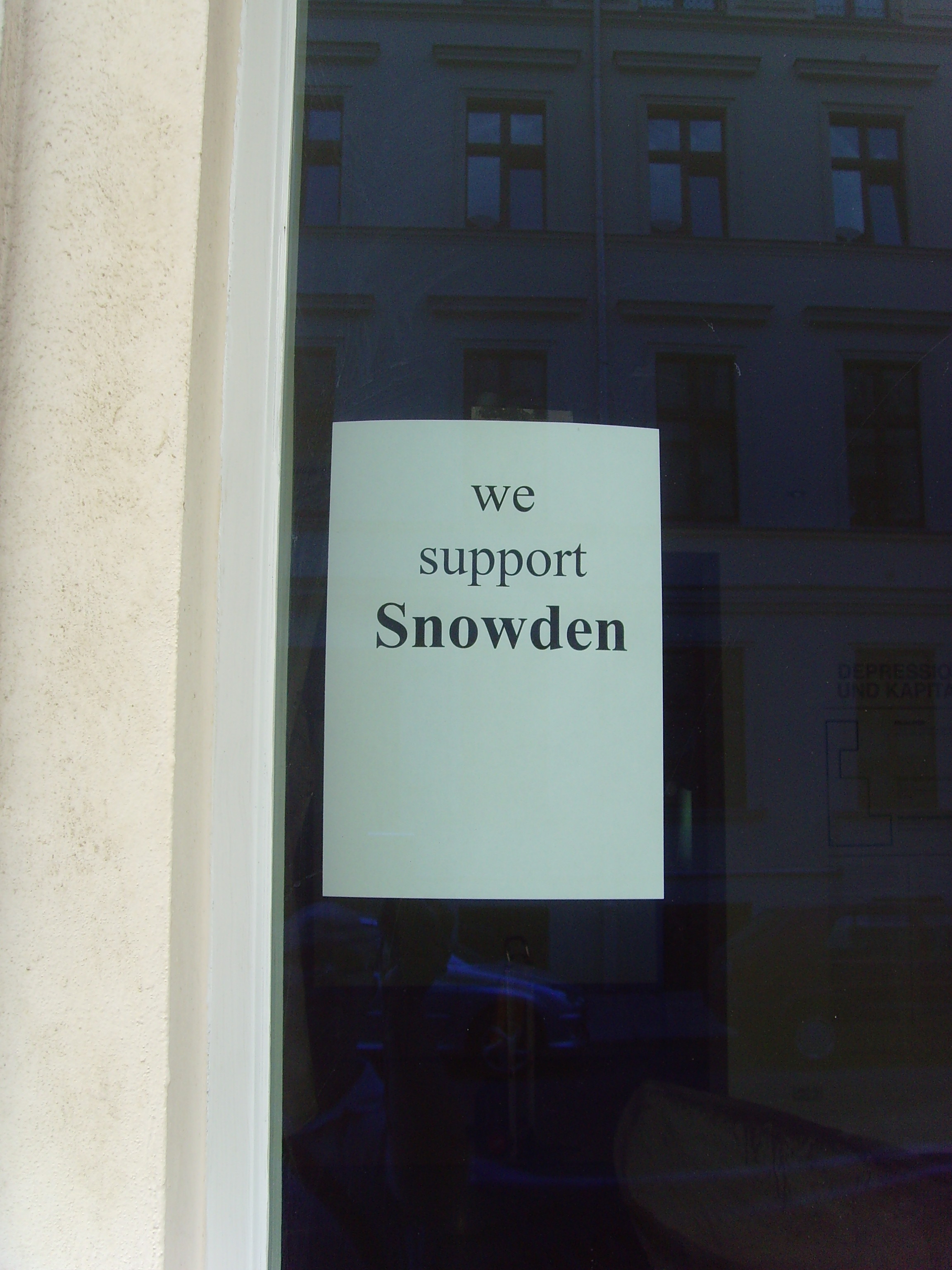 Eben noch ein normaler Labrador, jetzt auf den Spuren der NSA. Und das mitten im Regierungsviertel. Ich verstehe nichts von Technik, aber als ich Hilka darauf hinwies, dass dort unten links doch “Strom” stünde, schüttelte sie nur verständnislos den Kopf. Ich habe ja keine Ahnung. Ihnen dürfe ich aber nur soviel verraten, dass das Ganze auch dem Schutz Edwards Snowdens gelte. Auch einen sicheren Aufenthaltsort für Edward Snowden in Deutschland hält sie, wie sie es etwas nebulös ausdrückte, “nicht für ausgeschlossen”. Vielleicht hatte sie auch diesen Aushang im Schaufenster einer benachbarten Galerie im Regierungsviertel gelesen.