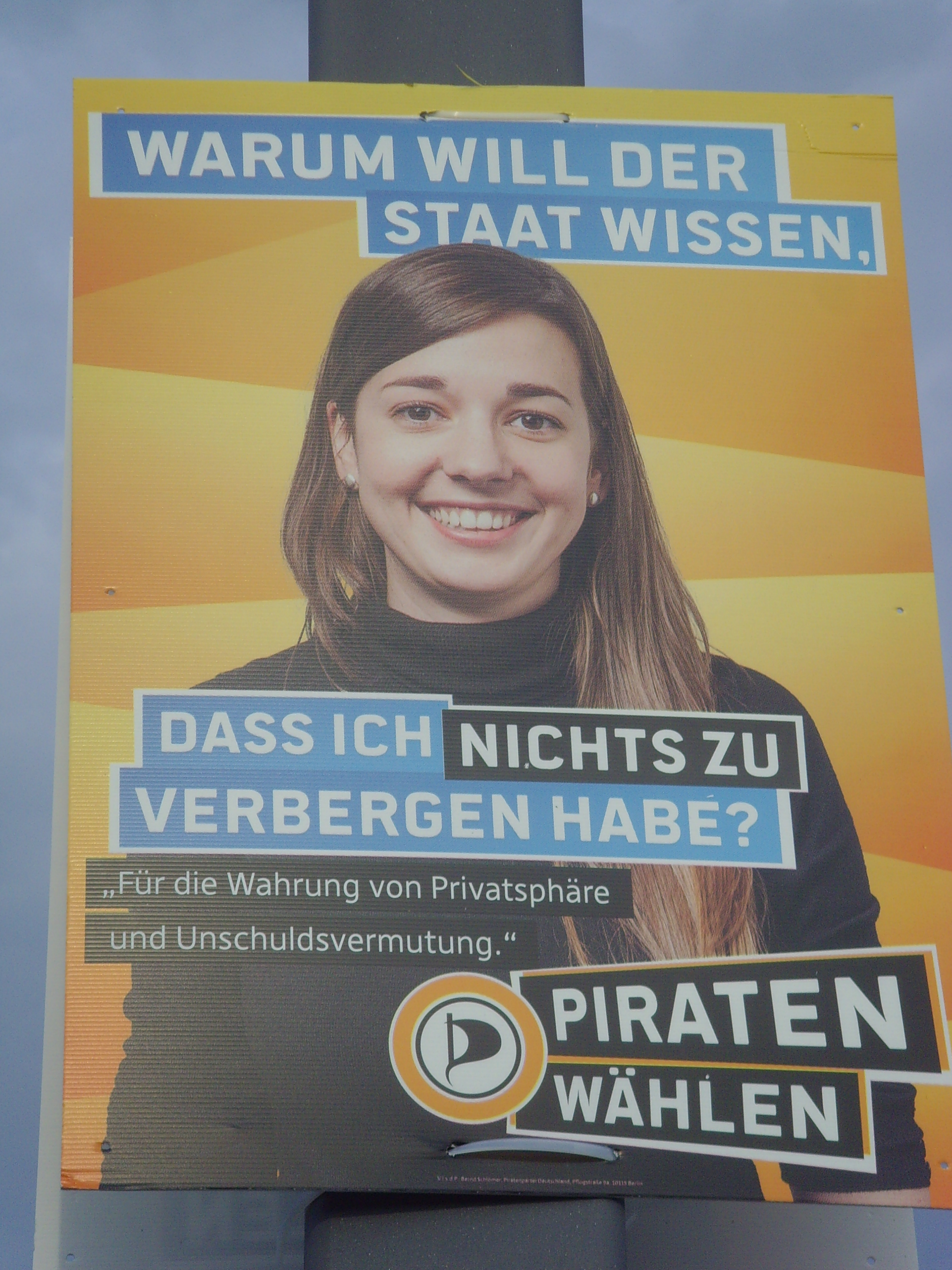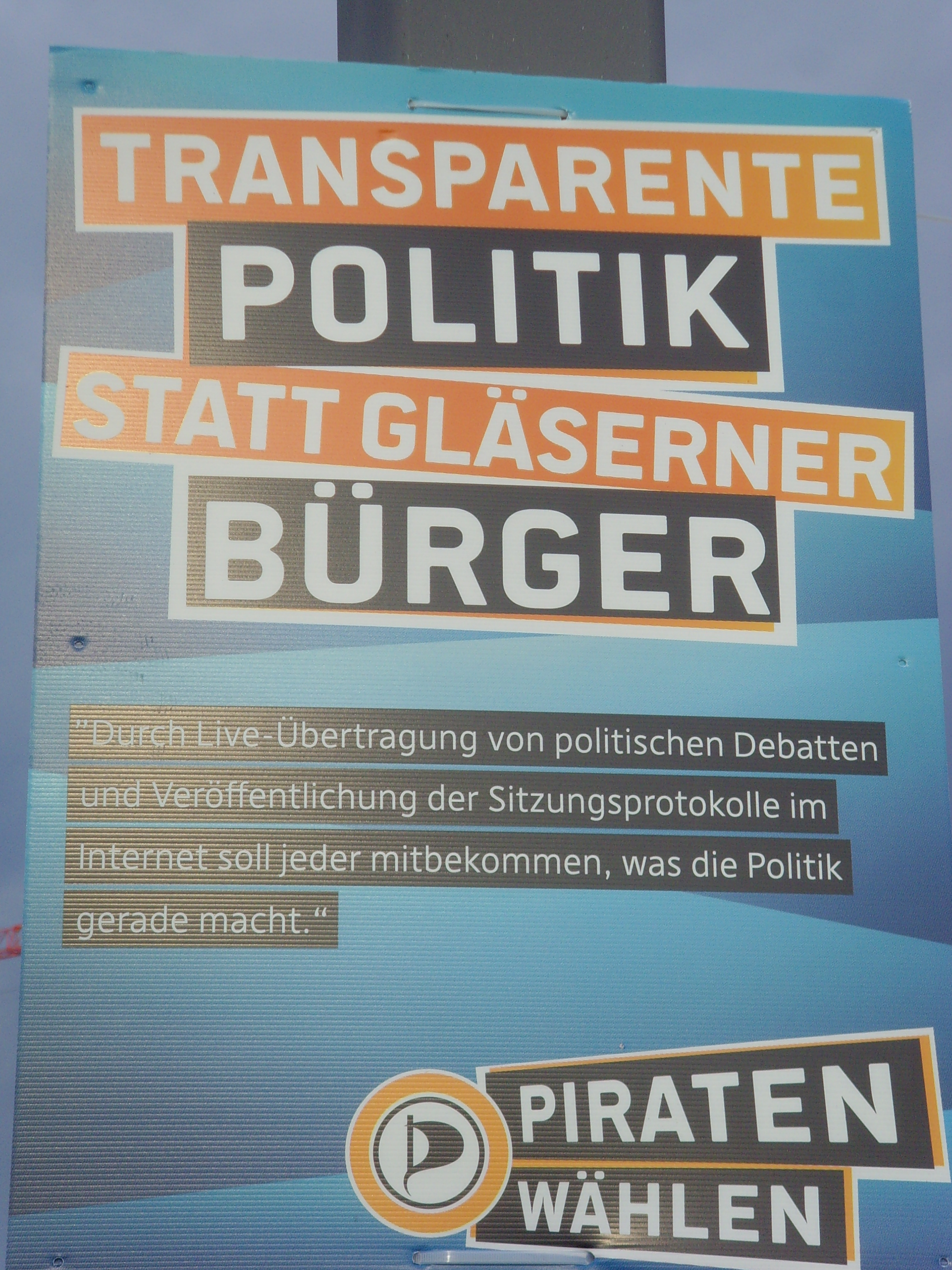 Die meisten Botschaften halten jedoch die Piraten parat, weswegen wir unten auch gleich einige Plakate abbilden. Mir haben sie von Inhalt und Aufmachung am besten gefallen. Ob sie es mit ihren Inhalten doch noch in den Bundestag schaffen. Die Linke haben wir nicht vergessen. Es hingen nur weit und breit am heutigen Morgen noch keine Plakate im Regierungsviertel.