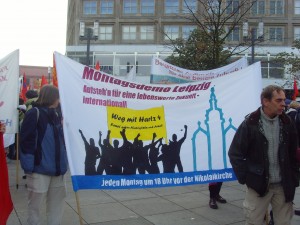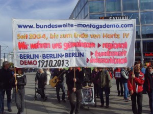 Auch wenn ich Euch jetzt nur mental sehe, freut es mich, dass Ihr zur zehnten Herbstdemonstration erschienen seid. Dafür erstmal ein Dankeschön. Es ist sehr wichtig, dass sich immer mehr Menschen, viel viel mehr Menschen auf der Straße versammeln, um sich gegen die unsägliche Agenda 2010 oder sprich aktuell Hartz IV aussprechen. Die Agenda 2010, ein Machtinstrument, welches in die gewollte Armut führte inklusive Altersarmut und weiter führt, den prekären Arbeitsmarkt immens steigerte und die Menschen in Ängste treibt. Existenzängste, Scham, Mutlosigkeit, Kinderarmut, Flaschensammler, Willkür und die Bedrohungen durch die Sanktionen prägen das heutige Bild der Arbeitsmarktreform aus dem Jahr 2003. Zehn Jahre, die den Neoliberalismus förderten, in denen Lobbyisten immer stärker geworden sind und weiter werden, und Hartz IV-Empfänger bis heute stigmatisiert werden.