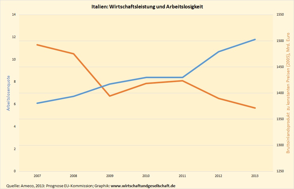 Dabei bräuchten sich der Journalist und der EZB-Präsident nur die Entwicklung der Wirtschaftsleistung und der Arbeitslosigkeit anzugucken, um zu sehen, was die bisherige Politik bewirkt hat, und was für politischen Sprengstoff die Folgen dieser Politik in sich bergen. Weil der Journalist und Draghi Italien angesprochen haben, hier die Entwicklung für Italien. Die Entwicklung der anderen Krisenländern ergibt kein anderes Bild (siehe auch: Griechenland/Eurokrise: Nährboden für radikale Parteien [im Abonnement]).