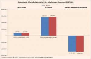 Ein Arbeitsmarkt, in dem die Zahl der Arbeitslosen (Arbeitsangebot) höher ausfällt, als ein Jahr zuvor, und in dem gleichzeitig die Zahl der offenen Stellen (Arbeitsnachfrage) niedriger ausfällt, als ein Jahr zuvor, kann niemals ein “insgesamt boomender Arbeitsmarkt” sein. Das hohe negative Ergebnis aus der Differenz zwischen Arbeitsnachfrage und Arbeitsangebot spricht darüber hinaus Bände über die Chancen und das Kräfteverhältnis auf dem Arbeitsmarkt.