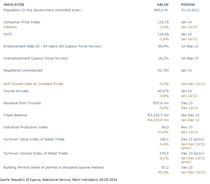 Seit der Zustimmung Zyperns zum “Rettungsschirm” und den damit verbundenen Auflagen im Mai 2013 ist die Zahl der Arbeitslosen nach den jüngsten Zahlen der zypriotischen Regierung von 44.424 (Mai 2013) auf 52.783 (Januar 2014) gestiegen. Zwischen Juli und Dezember 2013 lag die Arbeitslosenquote bei 16,2 Prozent. Im ersten Quartal 2013 lag die Arbeitslosenquote noch bei 11,8 Prozent. Das reale Bruttoinlandsprodukt lag nach Angaben derselben Quelle zuletzt im vierten Quartal 2013 um 5,3 Prozent unter dem des Vorjahresquartals. Die Verbraucherpreise sind im Januar 2014 gegenüber Januar 2013 um 2,9 Prozent gefallen. Alle wesentlichen Wirtschaftsindikatoren liegen tief im Minus.