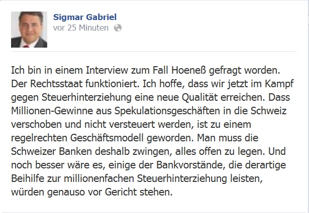 Auf der offiziellen facebook-Seite des Bundeswirtschaftsministers und SPD-Vorsitzenden ist heute früh dies zu lesen: