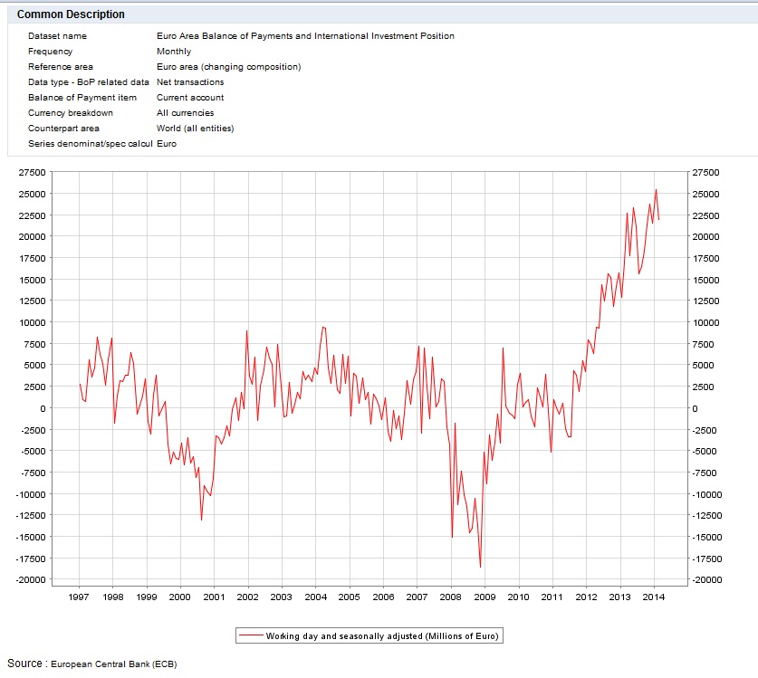 Wie die Graphik der EZB unten zeigt, geht der Leistungsbilanzüberschuss (hier monatlich) der EWU seit geraumer Zeit steil nach oben.