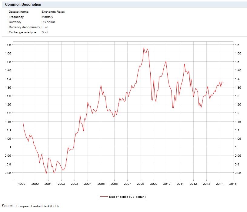 Was diese Strategie ausblendet: Dieses Rezept, das Deutschland seit der Agenda 2010 konsequent verfolgt, konnte seine Wirkung nur entfalten, weil gerade andere Länder der EWU dem deutschen Beispiel nicht folgten und entsprechende Leistungsbilanzdefizite in Kauf nahmen. Gegenüber dem Rest der Welt aber steht der Wechselkurs (siehe ausführlich hierzu zuletzt: Wechselkurs/Deflation: Es war klar, dass das deutsche “Wettbewerbsmodell” über den Euroraum hinaus nicht funktioniert [vollständiger Beitrag nur im Abonnement]). Seit einiger Zeit schon ist eine Aufwertung des Euro gegenüber dem US-Dollar zu beobachten. Solche Bewegungen hat es auch vorher schon gegeben, wie die Graphik unten veranschaulicht (Linie bis März 2014). Dennoch ist zu erwarten, dass die USA und andere Länder und Wirtschaftsräume nicht tatenlos zusehen werden, wie die EWU über Lohndumping versucht, Wettbewerbsvorteile und steigende Leistungsbilanzüberschüsse zu erzielen und darüber die anderen Länder zwingt, sich entsprechend zu verschulden (sehr schön spiegelt dies dieser Bericht wider, wenn man sich des oben skizzierten Hintergrunds bewusst ist).