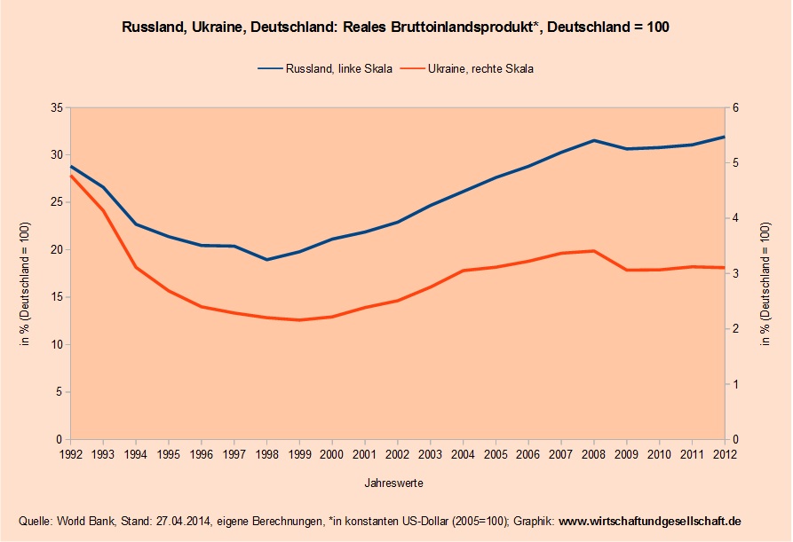 Beide Indikatoren, das Bruttoinlandsprodukt und das Bruttoinlandsprodukt pro Kopf, sind nur grobe Indikatoren für die Wirtschaftskraft und den Wohlstand eines Landes. Geht aus ihnen doch nicht hervor, aus welchen Quellen die Wirtschaftsleistung entsteht und wie gleich oder ungleich das Einkommen pro Kopf verteilt ist. Dennoch verweisen die drei unten abgebildeten Graphiken, in denen Deutschland gleich 100 gesetzt ist, auf eine große Kluft, die zwischen Deutschland und Russland und Deutschland und der Ukraine, aber auch zwischen Russland und der Ukraine besteht. Die Graphiken zeigen darüber hinaus, dass sich diese Kluft seit dem Umbruch zu Beginn der 1990er Jahre zum Nachteil der Ukraine weiter vergrößert hat und auch Russland nur leicht aufschließen konnte.