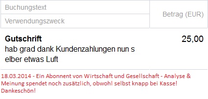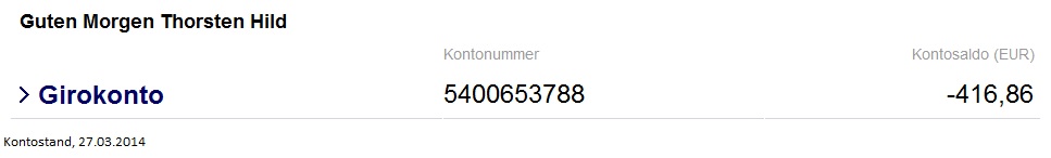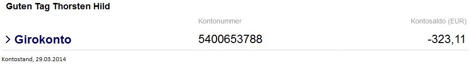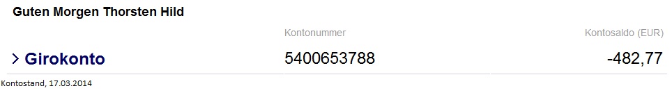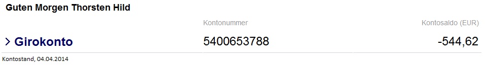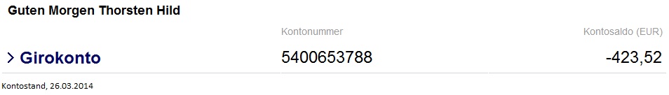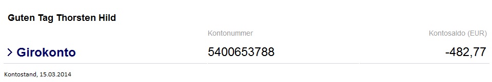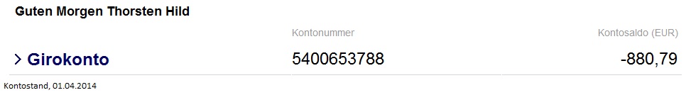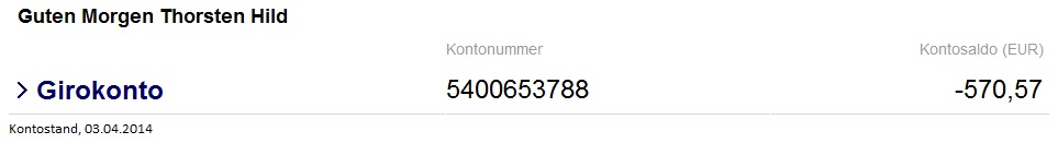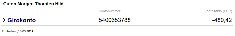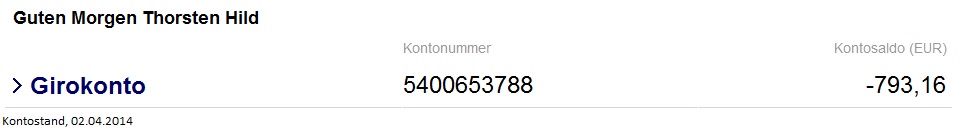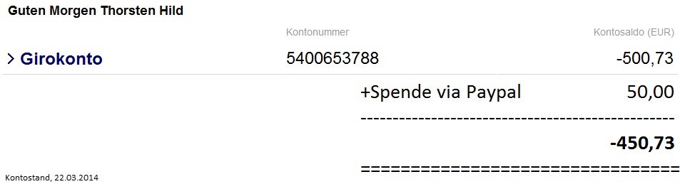 erst vor wenigen Tagen haben wir festgestellt: Das Interesse an den Inhalten dieser Seite ist durchaus schon beachtlich. Gleichzeitig weiß ich: Die Macht der Gewohnheit, Inhalte umsonst im Internet zu lesen, ist groß. Und doch muss ich erneut an Ihre Solidarität appellieren: Ich lebe von diesem Medium und meiner Arbeit dafür. Oder besser: Ich versuche es. Daher bin ich, daher ist dieses Medium auf Abonnements und Spenden angewiesen. Es geht dabei um die Existenz, nicht um Gewinn. Was sich hoffentlich noch ändern wird. Erst einmal aber wäre ich schon froh, wenn die Existenz gesichert wäre. Derzeit beträgt der Kontostand 300,41 Euro (Stand: 14.03.2014; jeweils aktueller Stand siehe unten). Davon muss ich jedoch heute noch Krankenkassenbeitragsrückstände von 711,83 Euro plus den Februar-Beitrag von 237,80 Euro an die DAK überweisen. Dann wartet auch schon fast wieder die Monatsmiete für den April…