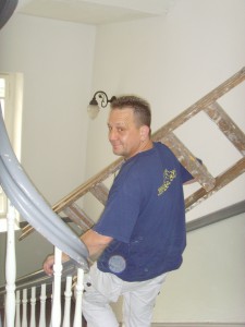 Na, jedenfalls gelang es mir, die Parklücken tapfer und redselig zu verteidigen, so dass Herr Teichert entspannt direkt vor der Haustür einparken konnte. Und dann ging es nach kurzer Begrüßung auch schon los: Die Leiter losgeschnallt, Eimer, Pinsel, Rolle, Abdeckplane, und alles, was halt so dazu gehört zum professionellen Malen.