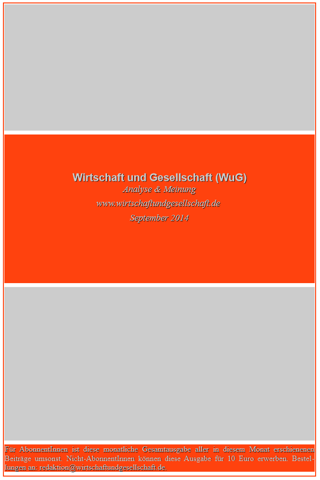 Immer mehr Menschen lesen Texte mit einem elektronischen Lesegerät. Die meisten Menschen lesen laut Umfragen darüber hinaus längere Texte immer noch am liebsten in gedruckter Form. Wirtschaft und Gesellschaft – Analyse & Meinung (WuG) möchte diesen Vorlieben gern entgegenkommen und gibt seit August 2014 am Ende eines jeden Monats eine Edition aller im Monat veröffentlichten Beiträge heraus, die im pdf.-Format erscheint. AbonnentInnen von WuG können diese Edition mit ihrer für den Monat gültigen PIN lesen und herunterladen: Edition September 2014. Nicht-AbonnentInnen können die Edition für 10 Euro erstehen und bekommen diese dann per E-Mail zugesendet. Bestellungen an: info@wirtschaftundgesellschaft.de.
