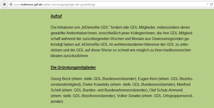 Unter den Gründungsmitgliedern der “Initiative” ist auch der ehemalige Vorsitzende der GDL, Manfred Schell. Er war es, der vor Siewke mit ähnlichem Tenor in Artikeln zitiert wurde, die sich gegen Weselsky und den Streik richteten. Jetzt wissen wir zumindest, woher auch dieser Wind wehte.