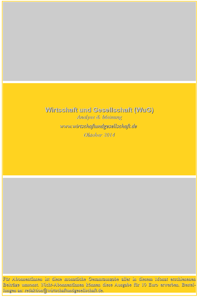Jeden Monat ein ganzes Buch, genauer: ein ganzes E-Book! Immer mehr Menschen lesen Texte mit einem elektronischen Lesegerät. Die meisten Menschen lesen laut Umfragen darüber hinaus längere Texte immer noch am liebsten in gedruckter Form. Wirtschaft und Gesellschaft – Analyse & Meinung (WuG) möchte diesen Vorlieben gern entgegenkommen und gibt seit August 2014 am Ende eines jeden Monats eine Edition aller im Monat veröffentlichten Beiträge heraus, die im pdf.-Format erscheint. AbonnentInnen von WuG können diese Edition mit ihrer für den Monat gültigen PIN lesen und herunterladen: Edition Oktober 2014. Nicht-AbonnentInnen können die Edition für 10 Euro erstehen und bekommen diese dann per E-Mail zugesendet. Bestellungen an: info@wirtschaftundgesellschaft.de.