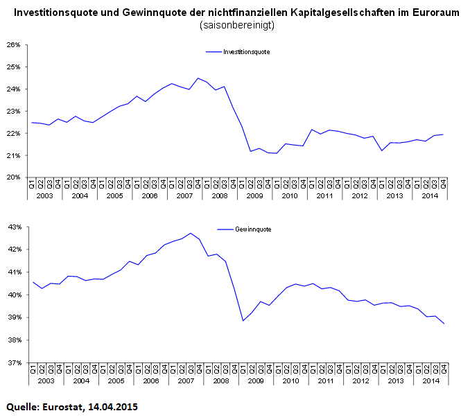 So auch bei den Sachinvestitionen. Passend dazu publizierte einen Tag zuvor die Entwicklung der Investitionsquote, die sich im Euroraum bis heute nicht von ihrem Einbruch bei Ausbruch der Finanz- und Eurokrise erholt hat. Und so auch die Gewinne der Unternehmen, die aufgrund des kontraktiven Wirtschaftsverlaufs – für den die Unternehmensverbände mit verantwortlich zeichnen, indem sie auf niedrige Löhne und staatliche Ausgabenkürzungen setzen – ebenfalls eingebrochen und weiter rückläufig sind.
