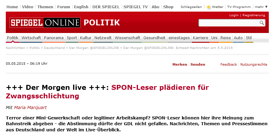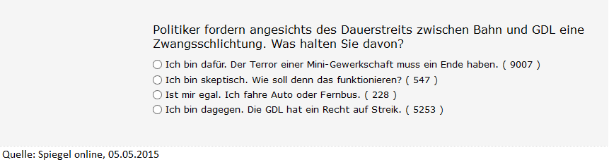 Spiegel online hat nach seiner heftigen Propaganda gegen die GDL und den Bahnstreik (siehe dazu zuletzt hier) eine Umfrage unter den eigenen Lesern gemacht und prahlt nun mit dem Ergebnis: