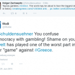 “Die Welt” lässt in ihren Beiträgen zu Griechenland die letzten Hüllen fallen und gebärdet sich ganz ungeniert als Sturmgeschütz gegen die Demokratie. Da ist , der auf twitter Demokratie mit Glücksspiel verwechselt – und zu einem entsprechenden Text von einem Hugo Dixon verlinkt. Da ist Olaf Gersemann, der Demokratie mit Feigheit verwechselt und es “unerhört” findet, dass Tsipras “sein Volk über das Sparprogramm der Troika abstimmen lassen (will)”. Gersemann fürchtet nicht die Tyrannei des “Sparprogramms”, sondern die “Tyrannei der Mehrheit”, hier der griechischen Bevölkerung.