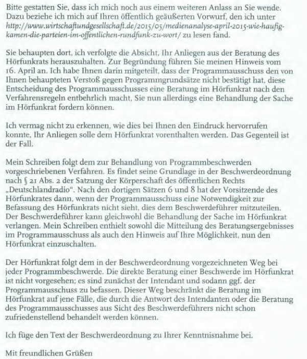 “Der Programmausschuss hat Ihr Anliegen in seiner Sitzung am 20. Mai nochmals eingehend erörtert…Ich greife der Beschlussfassung im September des Hörfunkrats nicht vor, wenn ich Ihnen mitteile, dass der Programmausschuss seine Auffassung bekräftigt hat, der zufolge die Auswahl der Interviewpartner im Deutschlandfunk nach journalistischen Gesichtspunkten und tagesaktuellen Bedürfnissen des Programms folgt. Er hat dem Hörfunkrat empfohlen, Ihre Beschwerde zurückzuweisen. Der Hörfunkrat hat sich in seiner Sitzung am 21. Mai ein Meinungsbild zu Ihrer Beschwerde verschafft, das der Empfehlung des Programmausschusses entsprach. Wie bereits erwähnt findet die abschließende Beratung jedoch am 10. September statt.”