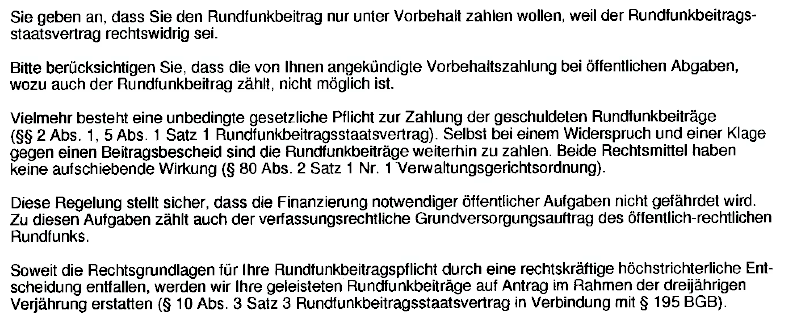 Ich bin kein Jurist. Wenn ein mit dem Gegenstand vertrauter Jurist hierzu eine andere Auffassung vertritt, als die oben vom Beitragsservice geäußerte, wäre ich für einen Hinweis und eine entsprechende Formulierung, die ich für ein Antwortschreiben benutzen kann, dankbar.
