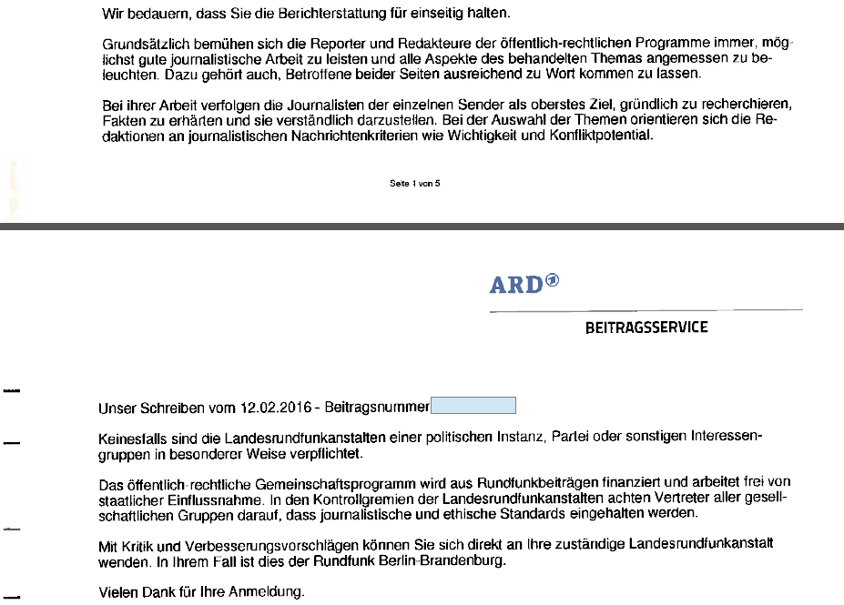 Geradezu sektenverdächtig ist jedoch die ebenfalls in dem Brief des Beitragsservice enthaltene Stellungnahme zu meinen Vorwürfen, dass der öffentlich-rechtliche Rundfunk nicht frei von parteipolitischer Beeinflussung und einseitiger Berichterstattung sei (siehe in meinem Brief an den Geschäftsführer des Beitragsservice hier). Der Beitragsservice beschwört Zustände im öffentlich-rechtlichen Rundfunk, die ich mir – und viele Millionen andere Hörer und Zuschauer sicherlich auch – herbeisehne, die aber, wie wir nicht zuletzt in unseren monatlichen Medienanalysen immer wieder festgestellt haben, reines Wunschdenken sind. Das hat schließlich auch das Bundesverfassungsgericht im Urteil zum ZDF-Staatsvertrag festgestellt (siehe dazu zuletzt einleitend hier und ausführlich hier und hier).