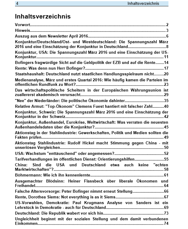 Jeden Monat ein ganzes Buch, genauer: ein ganzes E-Book. Immer mehr Menschen lesen Texte mit einem elektronischen Lesegerät. Die meisten Menschen lesen laut Umfragen darüber hinaus längere Texte immer noch am liebsten in gedruckter Form. Wirtschaft und Gesellschaft – Analyse & Meinung (WuG) möchte diesen Vorlieben gern entgegenkommen und gibt seit August 2014 am Ende eines jeden Monats eine Edition aller im Monat veröffentlichten Beiträge heraus (außer der in “WuG unterwegs”), die im pdf.-Format erscheint. AbonnentInnen von WuG können diese Edition mit ihrer für den Monat gültigen PIN lesen und herunterladen: Edition April 2016. Nicht-AbonnentInnen können die Edition für 10 Euro erstehen und bekommen diese dann per E-Mail zugesendet. Bestellungen an: info@wirtschaftundgesellschaft.de.